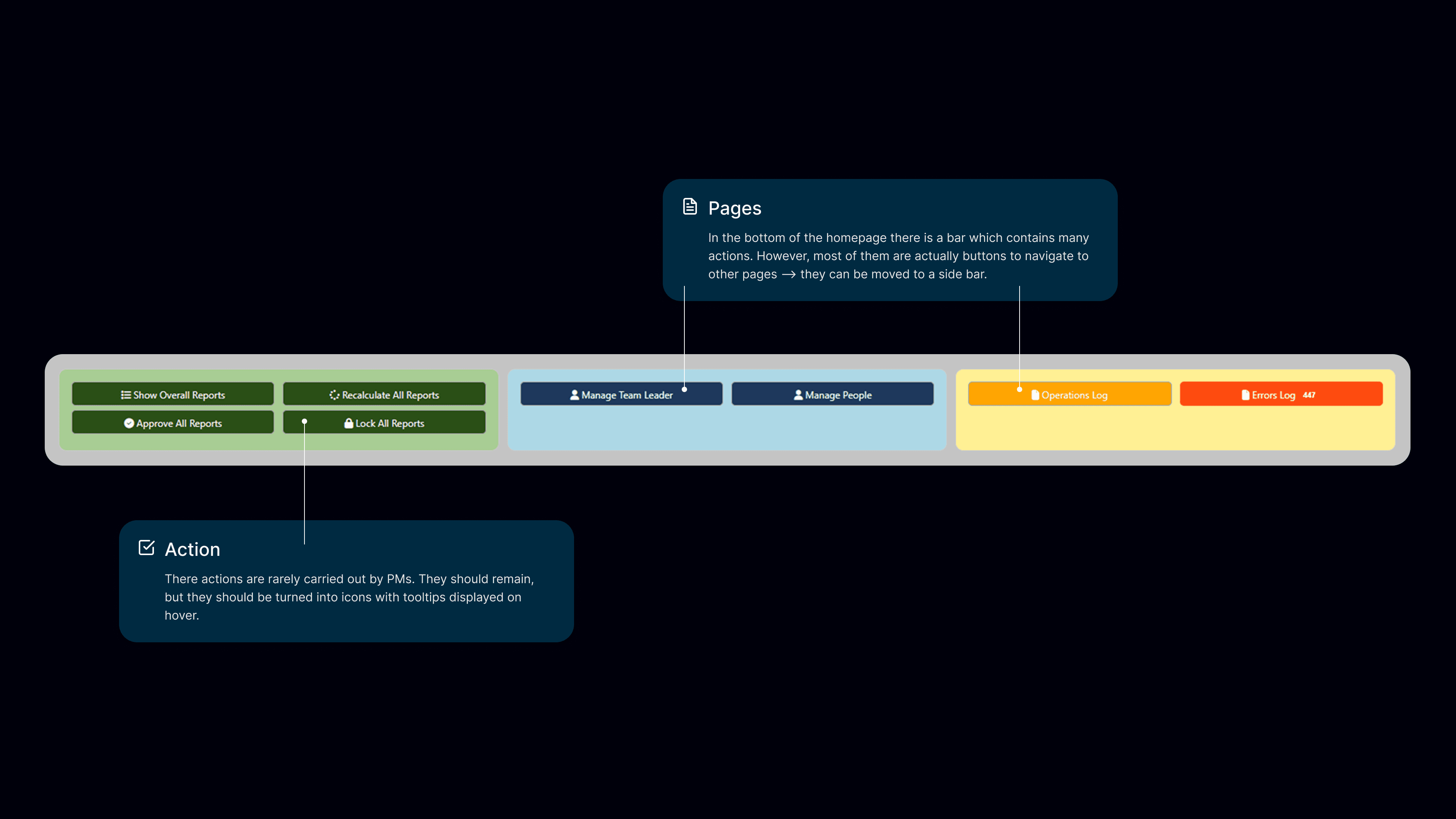 As a consequence, only a few actions remained available. Since many PMs never use them, I decided to turn them into icons-only buttons, with a tool tip that is displayed when hovering over the icon.
